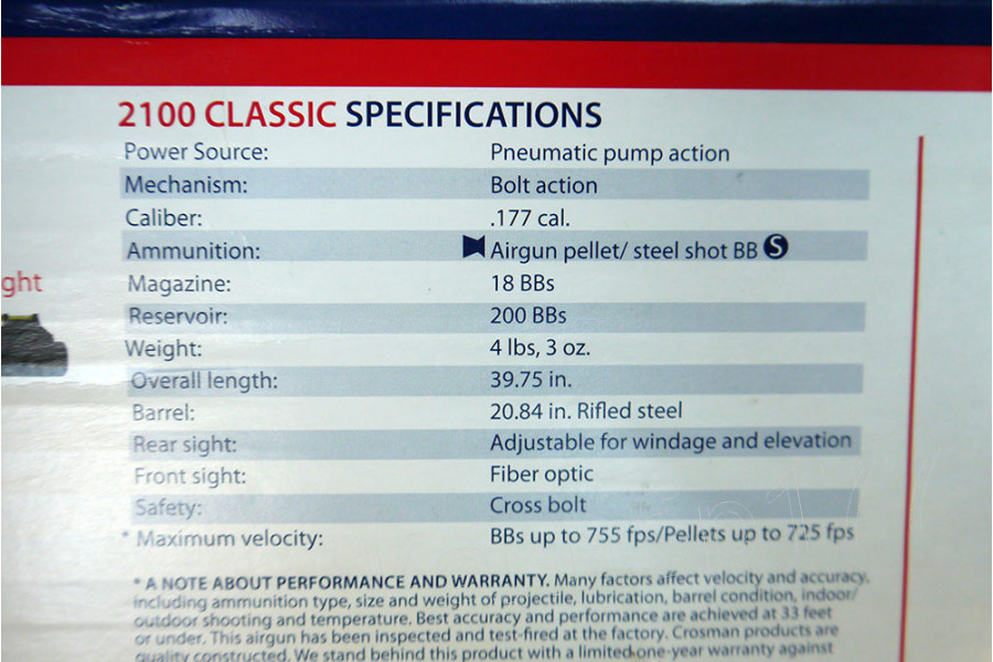 Интересные дела обстоят с сертификацией винтовки в России. По закону без разрешения продаются винтовки с дульной энергией до 7,5 Дж. Американцы же проверяют винтовку на 5 качках, что даёт энергию выстрела около 7 Дж. 10 качков дают в 2 раза больше скорости :) . Многие делают 12-15 качков, что выдаёт совсем запредельную скорость, а учитываю потенциал для модернизации, из пневматической винтовки Crosman 2100 возможно сделать «Магнум-класс» с помощью небольших апгрейдов.